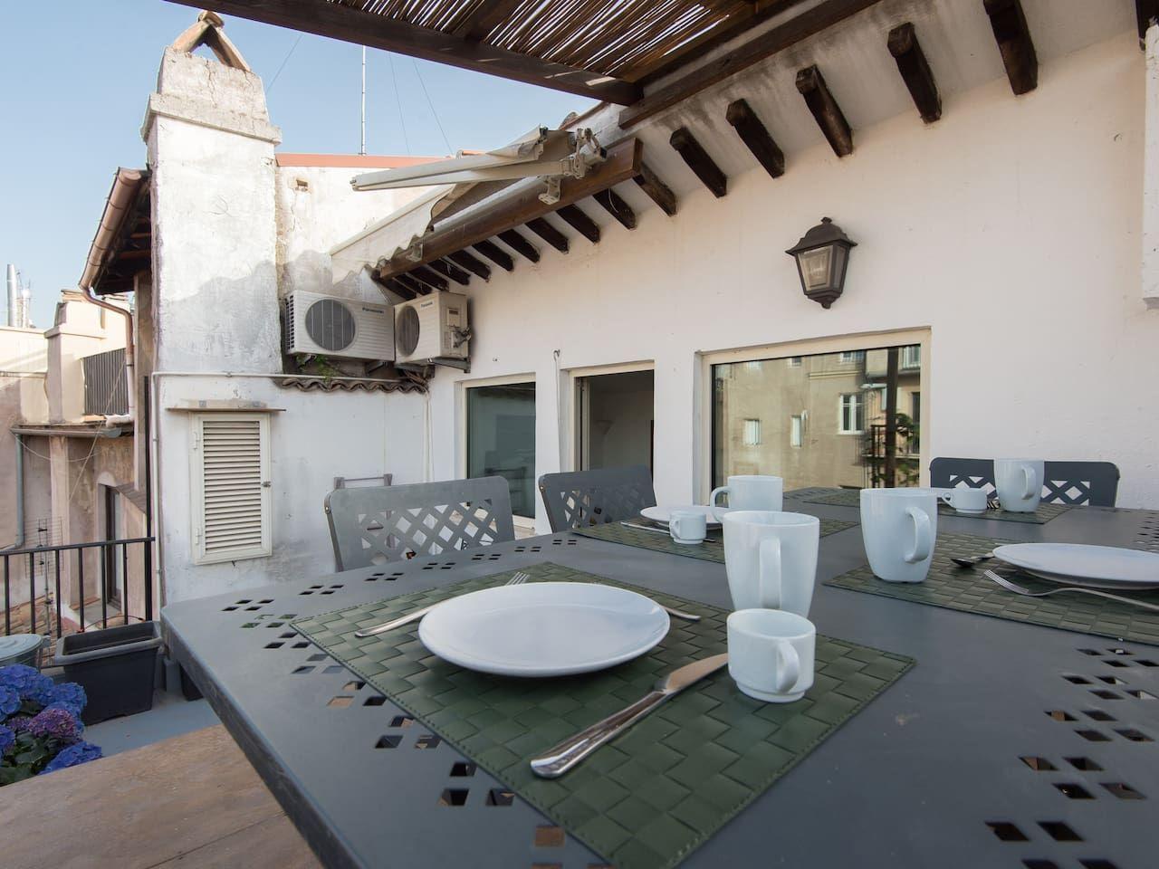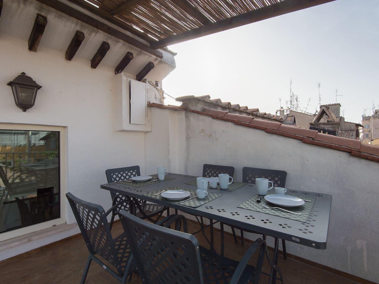 In un palazzetto del ‘700 con ascensore, l’appartamento si trova all'ultimo piano.Composto da 1 ingresso, 1 camera da letto matrimoniale con armadio, cassettiera, 2 comodini e tv, 1 disimpegno e 1 bagno con vasca e doccia. Al piano superiore, 1 salottino con divano letto, 1 cucinotto e sgabuzzino. Ma soprattutto una straordinaria terrazza abitabile che si affaccia sull’Arco degli Acetari, antico borgo medievale. Le stanze sono dotate di aria cond...